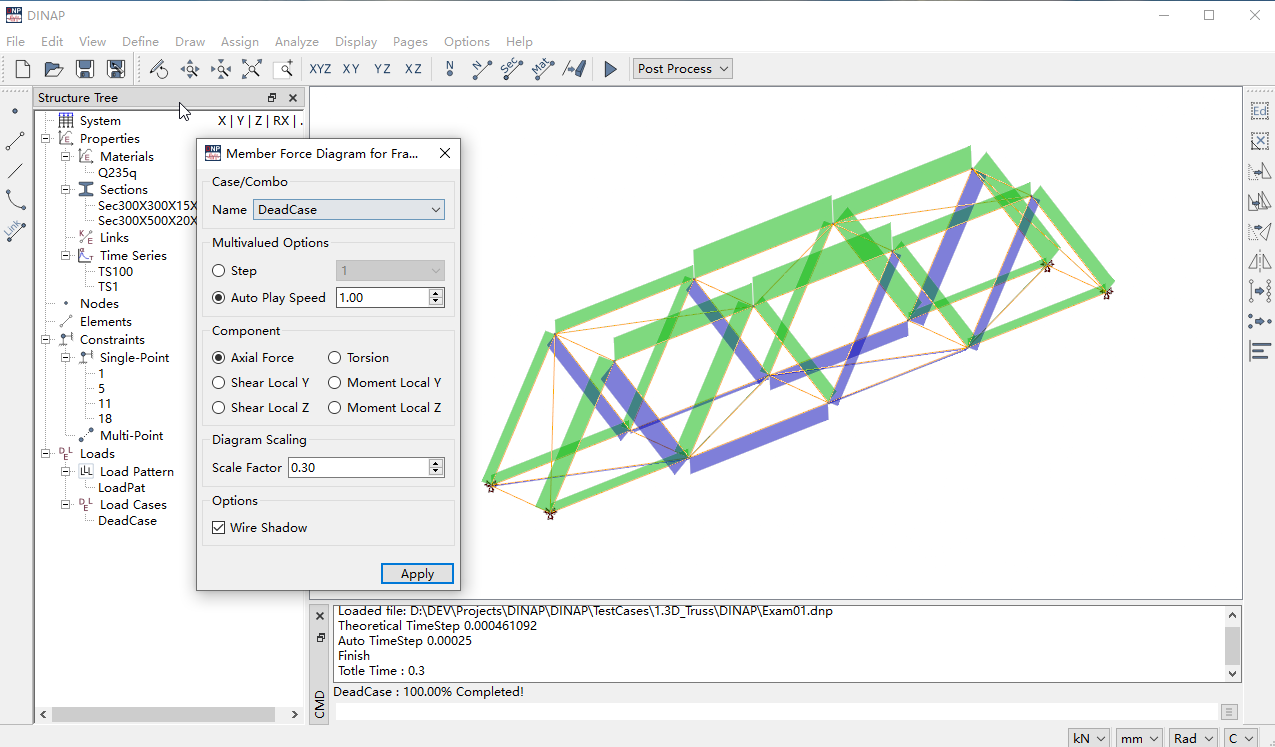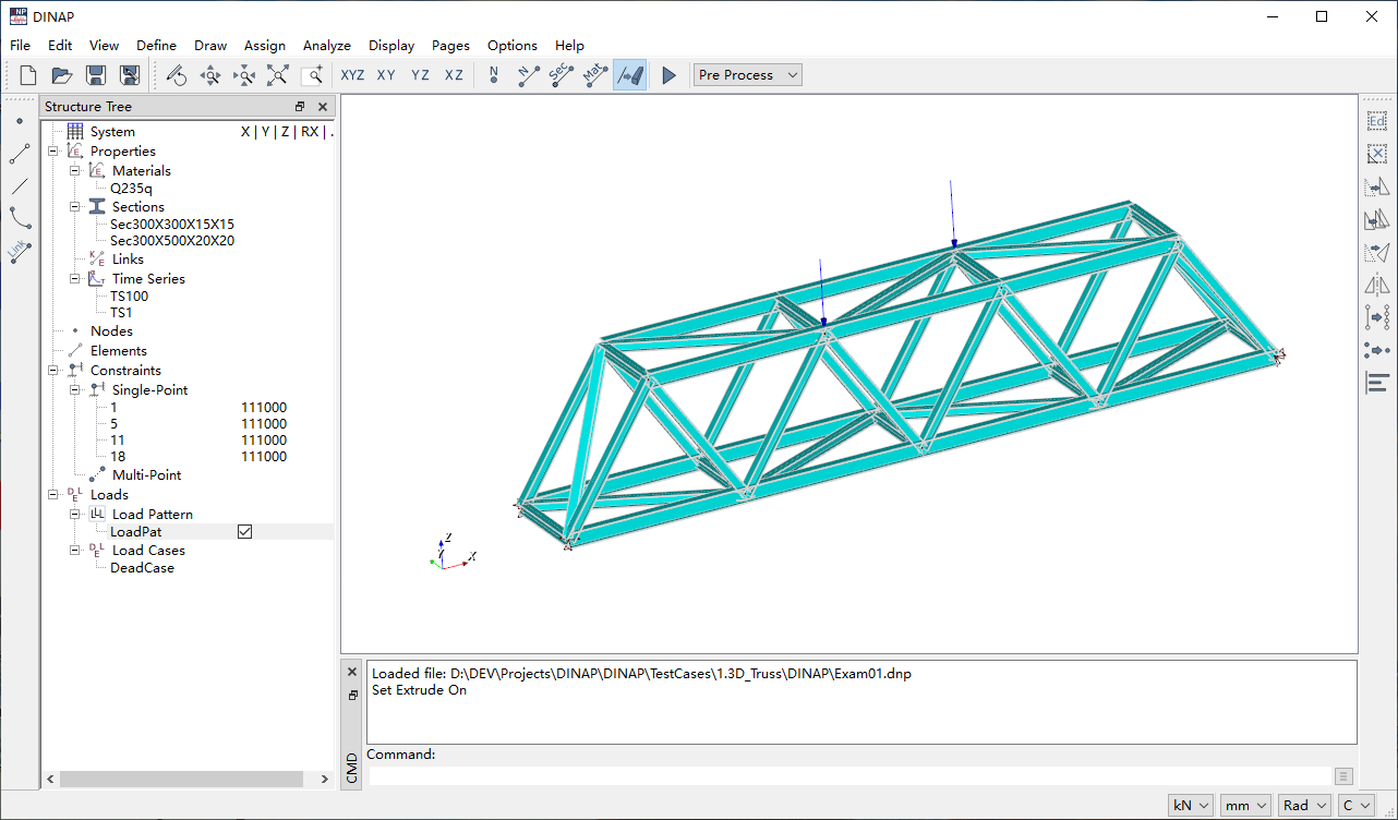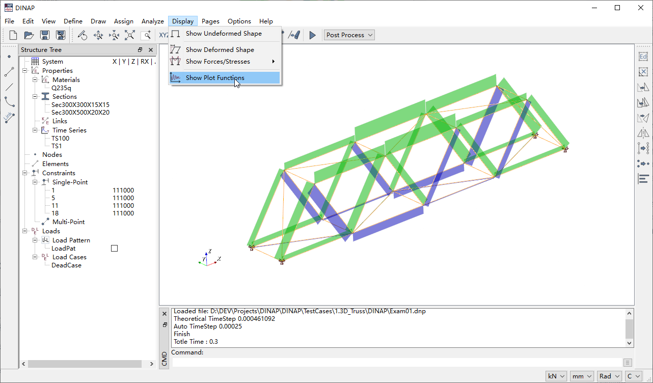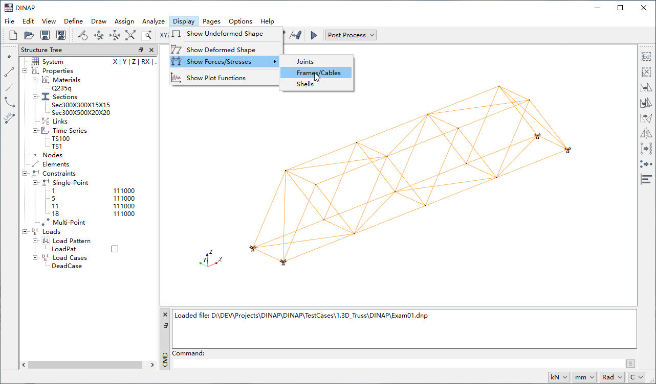 DINAP is a free, lightweight structural analysis program. Its graphical user interface is developed using the open-source QT interface library, and model visualization utilizes the open-source VTK visualization toolkit.
