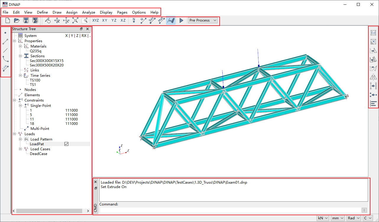 During DINAP’s development, I drew inspiration from many other software designs I consider excellent (not limited to finite element software), such as Midas Civil’s structure tree, AutoCAD’s command line and property panel, SAP2000’s clean interface, etc.